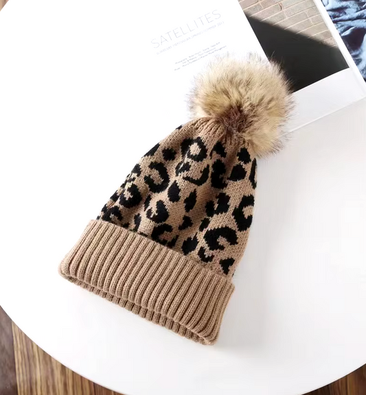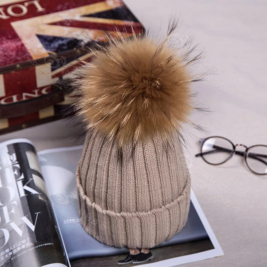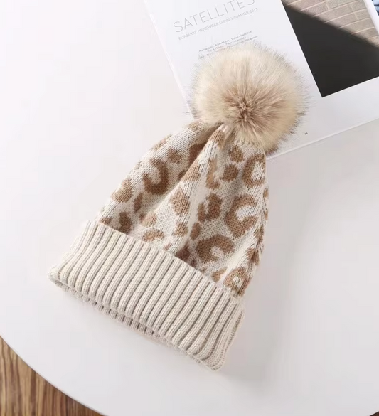 Fluffy Cable Knit Pom Pom Hat in Beige