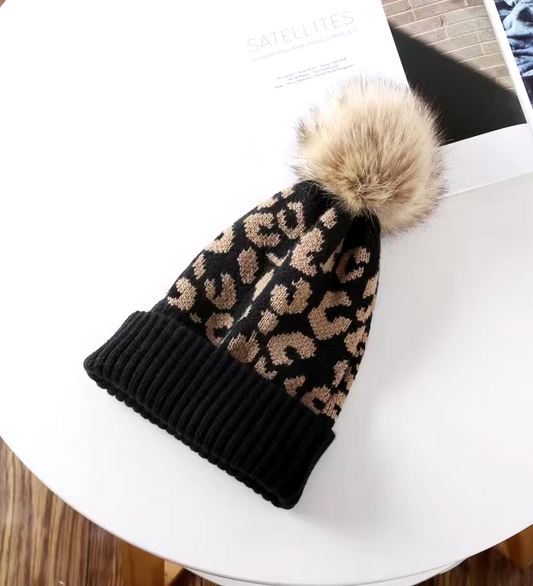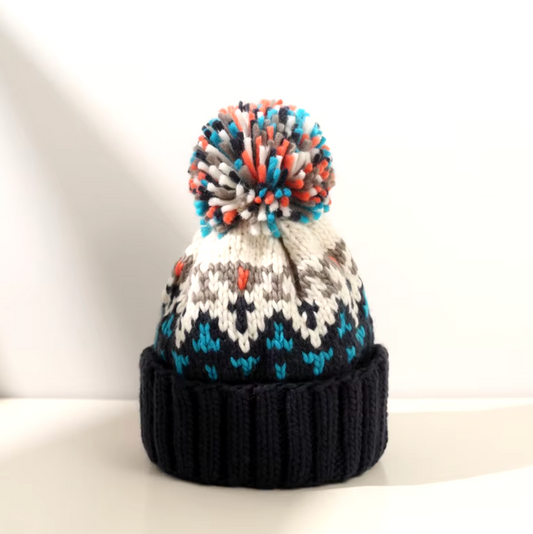 Fluffy Cable Knit Pom Pom Hat in Navy
