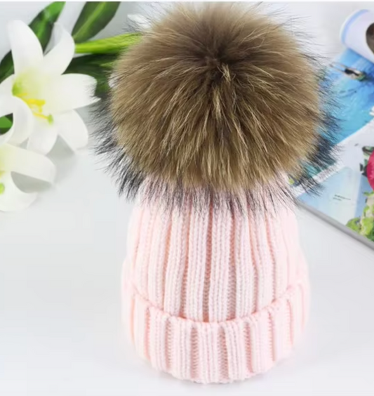 Fluffy Cable Knit Pom Pom Hat in Baby Pink
